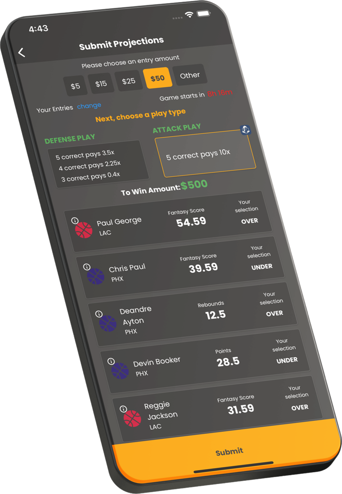 Choose up to 5 players, select if they go over or under their stat projection and win up to 20.5X your entry! A $25 entry wins you $512.5!